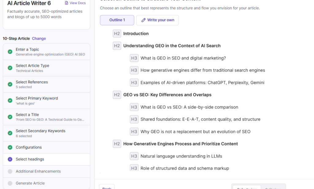 It suggests related topics, semantic terms, and even scores your draft for SEO and GEO (Generative Engine Optimization).