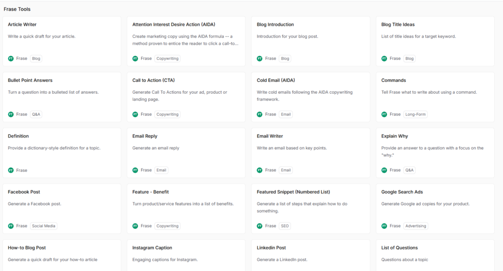 Frase offers 40+ AI tools for specific use cases like blog outlines, meta descriptions, product descriptions, and emails. You can even create your own AI tool with your pre-built instructions and task you want it for.